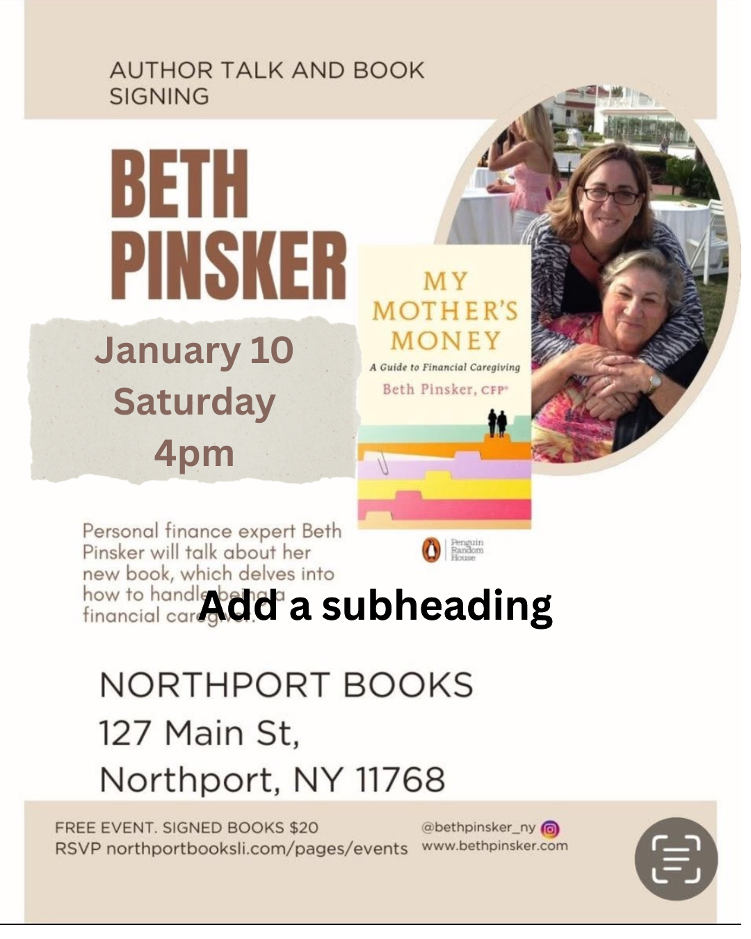 Personal finance expert Beth Pinsker will talk about her new book, which delves into how to handle being a financial caregiver.