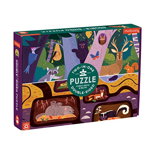 Mudpuppy's Forest Above & Below 100 Piece Double-Sided Puzzle features your favorite forest animals, forest floor and tree dwelling animals on one side and underground burrowing animals on the other. This two-in-one puzzle is a great family activity for adults and children to enjoy together. Puzzle pieces come packaged in a sturdy and easy-to-wrap box, perfect for gifting, reuse, and storage. - 100 pieces double-sided