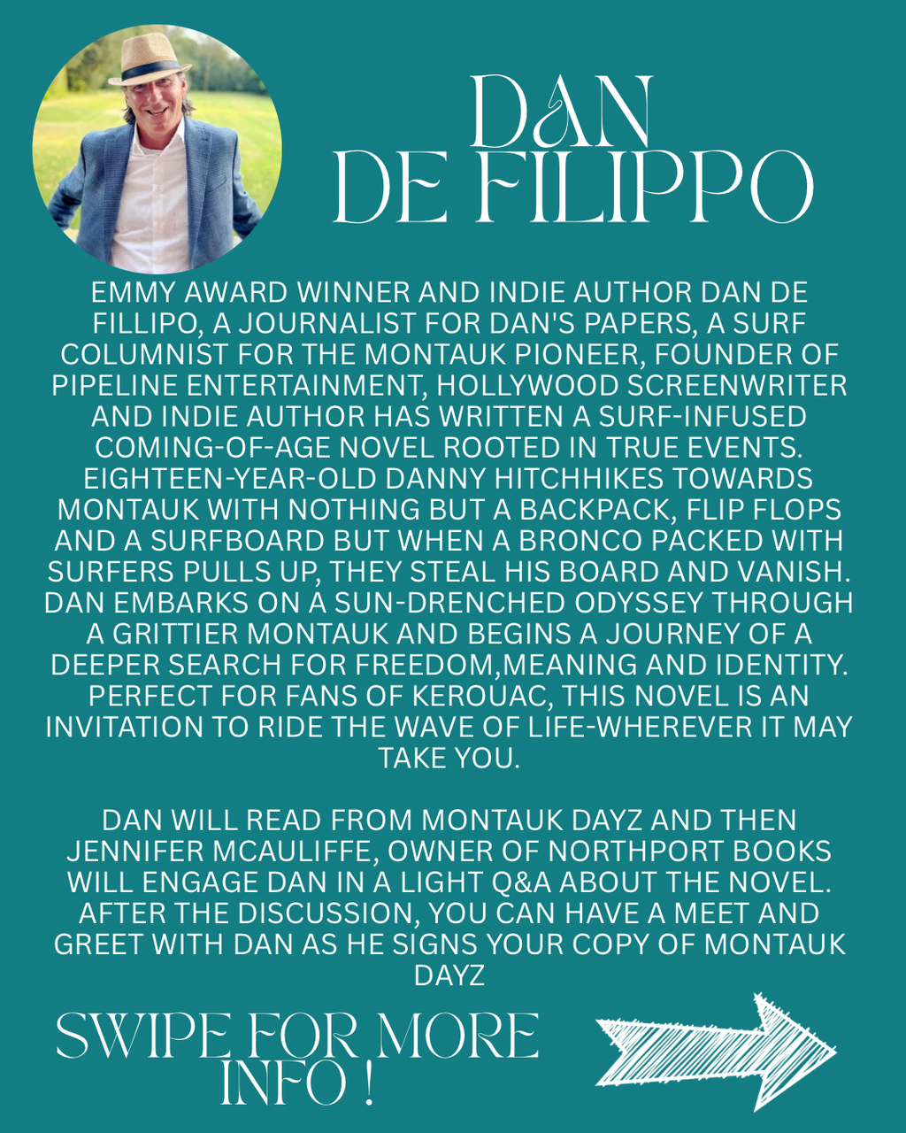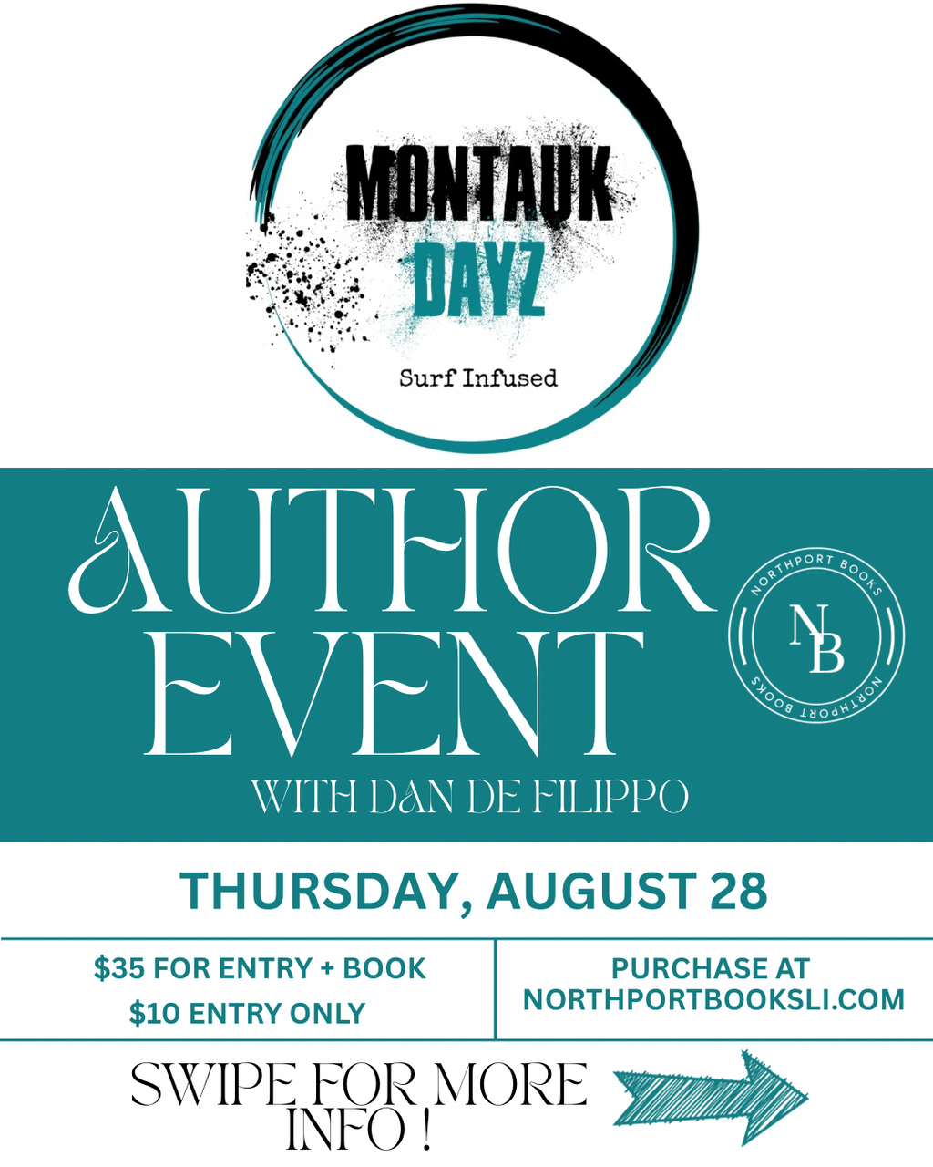 Dan will read from Montauk Dayz and then Jennifer McAuliffe, owner of Northport Books, will engage Dan in a light Q&A about the novel. After the discussion, you can have a meet-and-greet with Dan as he signs your copy of Montauk Dayz.