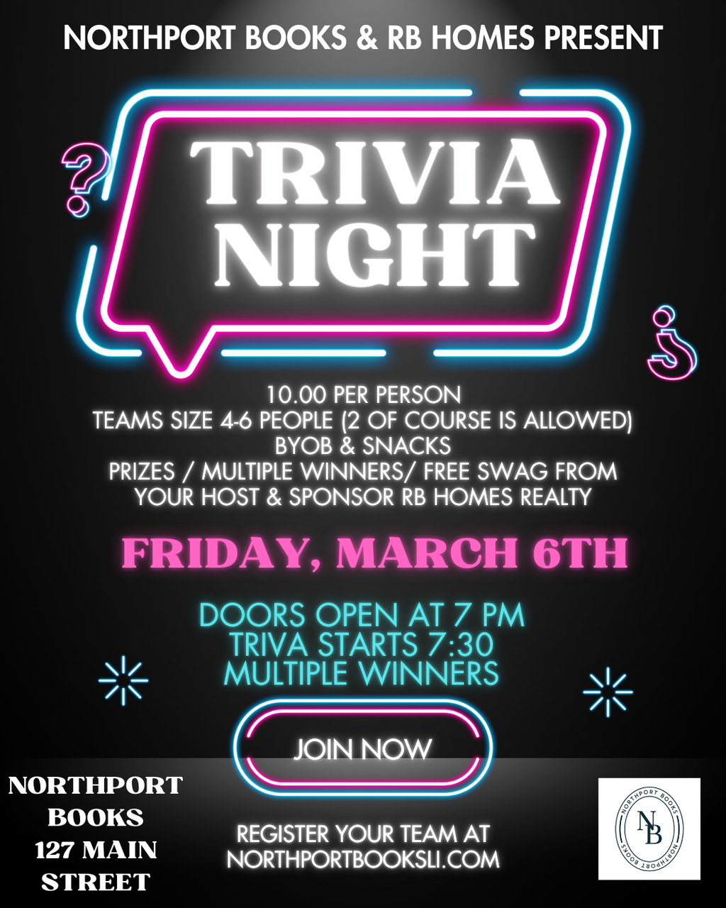 Grab your smartest friends and join us for Trivia Night at Northport Books, presented with RB Homes Realty โ a fun night of friendly competition, laughs, prizes, and snacks!